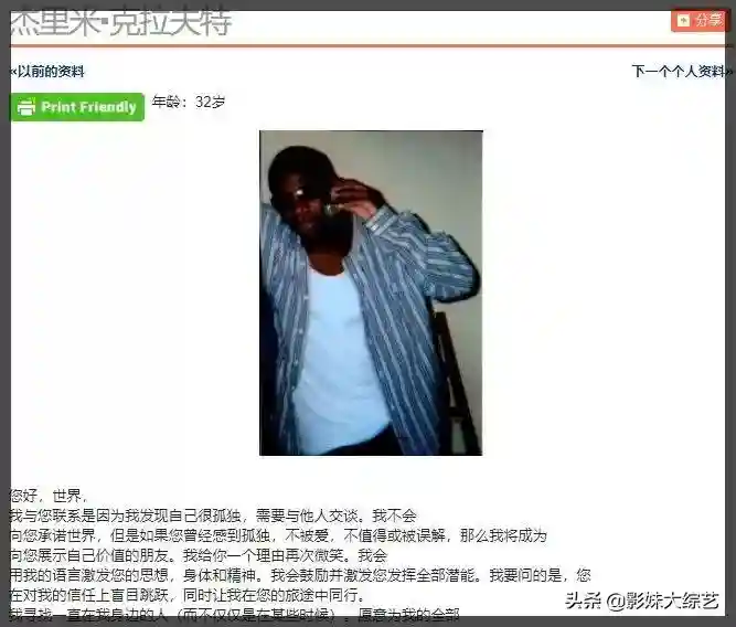 “我绰号big6,是来自华盛顿州惩戒所的英俊魔鬼。我大部分时间都在研究法律和锻炼身体,只为遇见一个可以诉说和倾听的你。”
