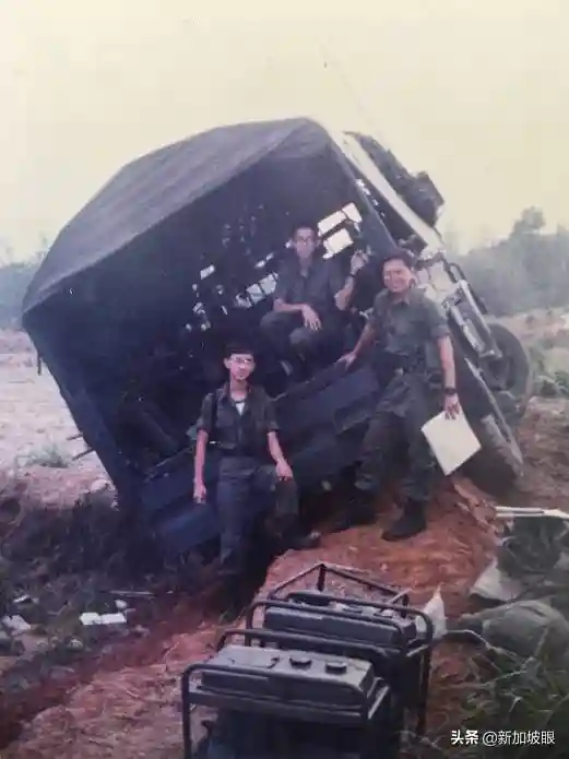 1989年星光部队在台湾中部进行炮兵实弹演习,其中一部电台车被卡在软土路里,等待救援车。当时穿的是国军军服。