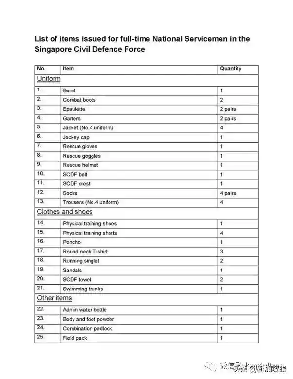 然后NSF就告别亲友,到旁边的仓库取军装和一应生活用品,应有尽有,包括口哨、锁头、缝纫包等等,单子很长,新加坡眼为您找到这张图做参考: