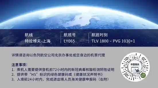 自9月6日起,自以色列出发、搭乘航班赴华(含直飞及经第三国或地区赴华)以及经以色列中转乘机赴华的中国公民,须凭新冠病毒核酸检测阴性证明申领带“HS”标识的绿色健康码。请相关乘客认真阅读使馆网站此前相关通知()、常见问题解答()及中国驻中转国使领馆网站发布的相关通知,严格按规定上传核酸检测阴性证明并申领健康码,在登机时向航空公司出示。