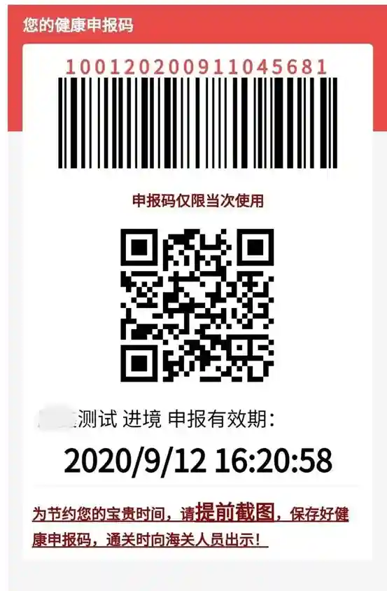 回国中国公民应在入境中国前24小时如实逐项填报“入境健康申明卡”(“海关旅客指尖服务”微信小程序),如有隐瞒或虚假填报,将承担法律责任。申报成功后可查看健康申报记录和红色的条形码。