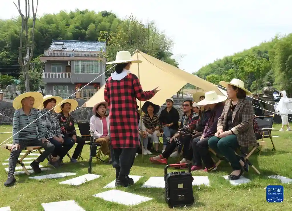 5月17日,在浙江省建德市航川村,“文艺村长”周霞(中)指导村民们进行声乐练习。该市在各镇街推行“文艺村长”工作制度,将有意愿的文艺工作者分派到农村开展教学。新华社记者翁忻旸摄