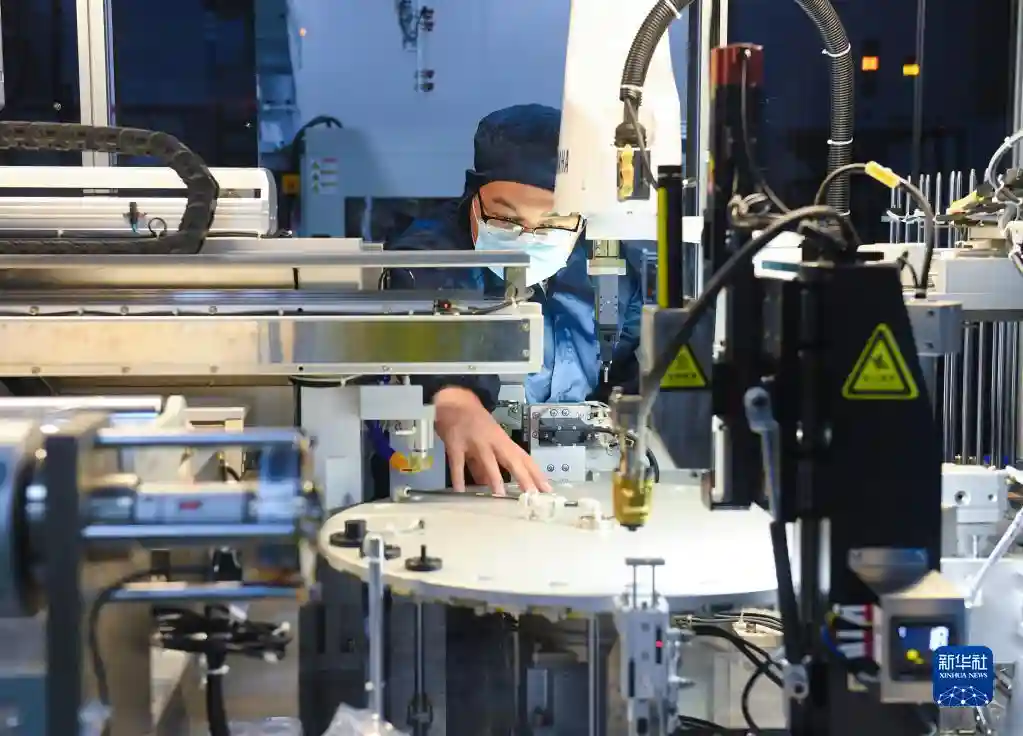 6月15日,在浙江省台州市仙居县一家医疗器械公司的生产车间,工作人员在调试生产线上的一套医学实验室设备。新华社记者翁忻旸摄