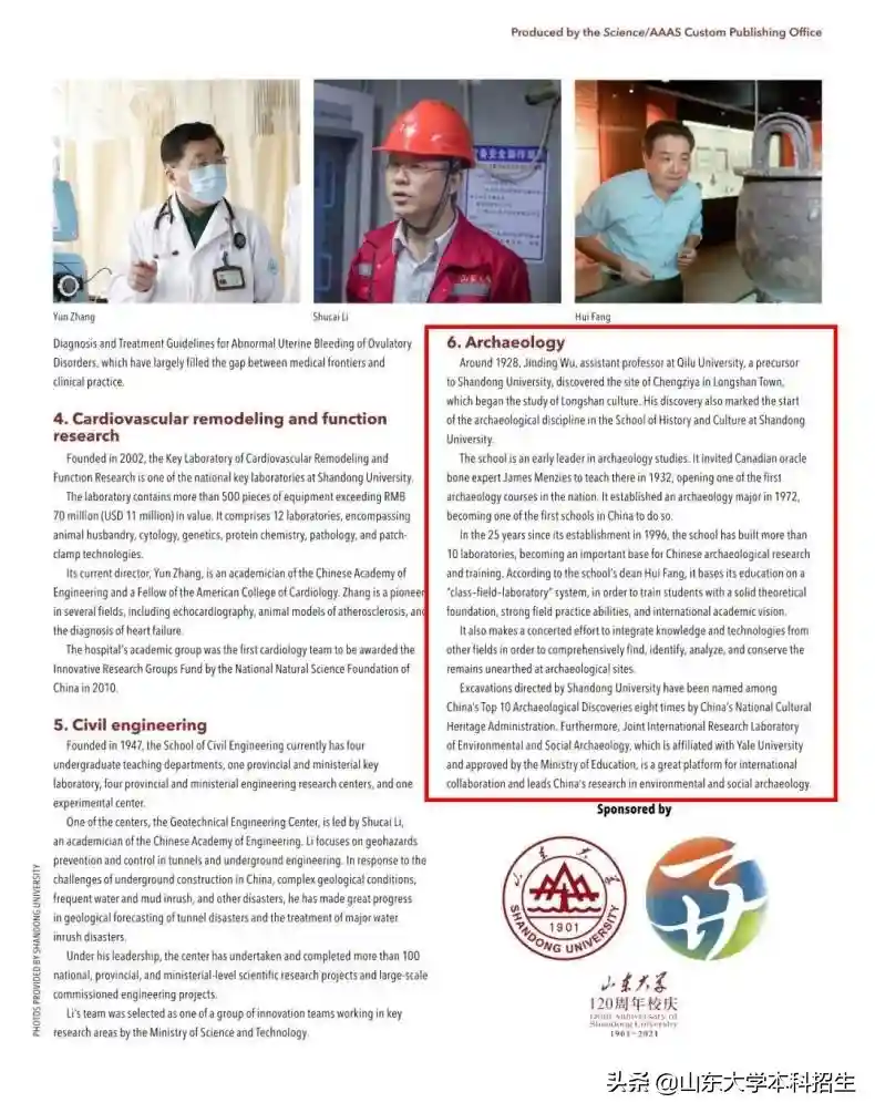 2021年10月8日,国际著名学术期刊Science(《科学》)以NobleinSpirit,lessinKnowledge:ShandongUniversitycelebrates120yearsofexcellence为题,推出山东大学校庆专题报道。报道主要围绕学校六大优势学科和重点领域进行介绍,其中就包括考古特别是科技考古,介绍学科带头人方辉教授及团队如何借力国际合作和跨学科手段发展考古学科。