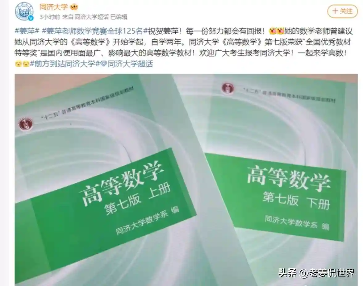 同样,6月14日,@同济大学发文祝贺姜萍:“每一份努力都会有回报!”@同济大学还在文中欢迎广大考生报考同济大学,呼吁一起来学高数!