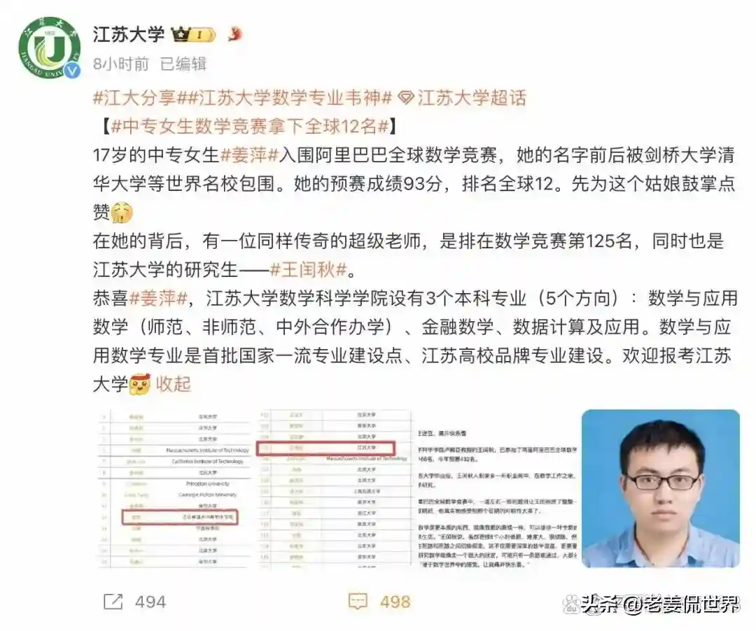 江苏大学先为姜萍点赞,后说学校的数学与应用专业是首批国家一流专业建设点,欢迎报考江苏大学。