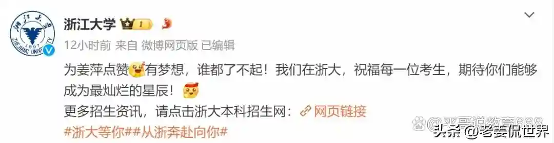 姜萍最大的理想是报考浙江大学服装设计专业,得知此消息后,网友问及浙江大学工作人员,得到的回复是涉及相关程序,他们无法回答。有意思的是,浙江大学特意留下本科招生网址,这是此地无银三百两还是对姜萍有所暗示?
