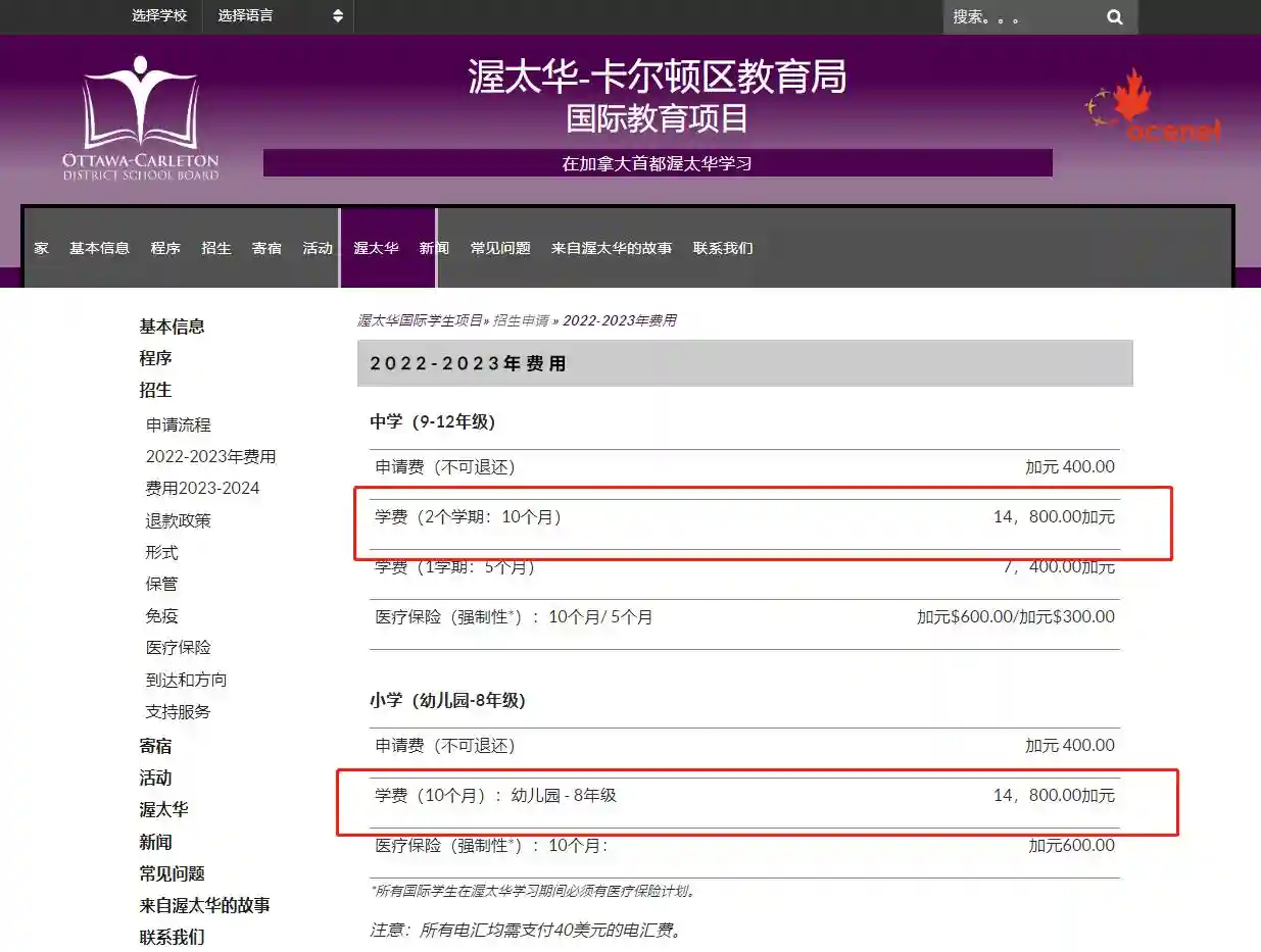 根据渥太华公立教育局卡尔顿区教育局公布的国际学生费用来看,它是一年两学期缴费,总共14800加元,再没有其他费用。