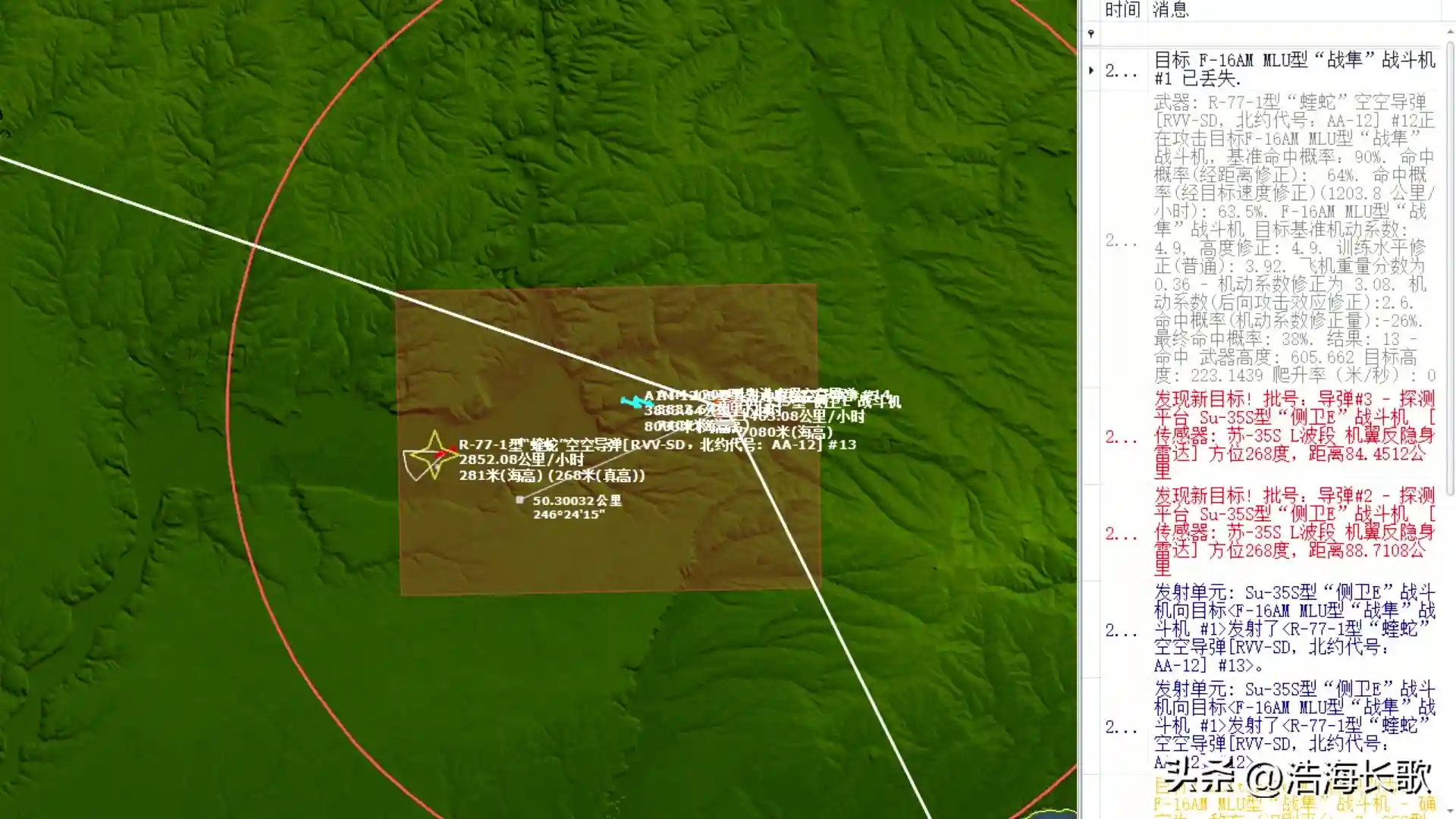 进入导弹射程后,苏35率先发射了2枚R-77-1型“蝰蛇”中距空空导弹,就在数秒后,F16AM也向苏35发射2枚AIM120B中程空空导弹。