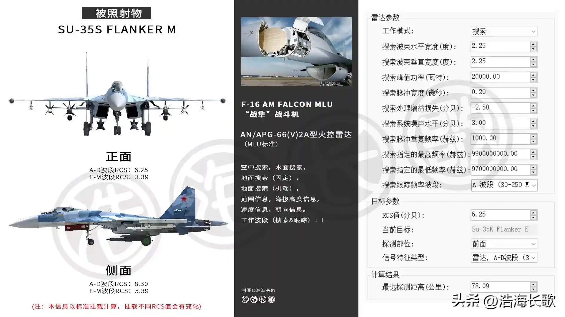 则F6AM的AN/APG-66(V)2A型火控雷达在A-D波段下对苏35的迎面探测最远距离为66.24公里,E-M波段下对苏35的迎头探测距离为78.09公里。