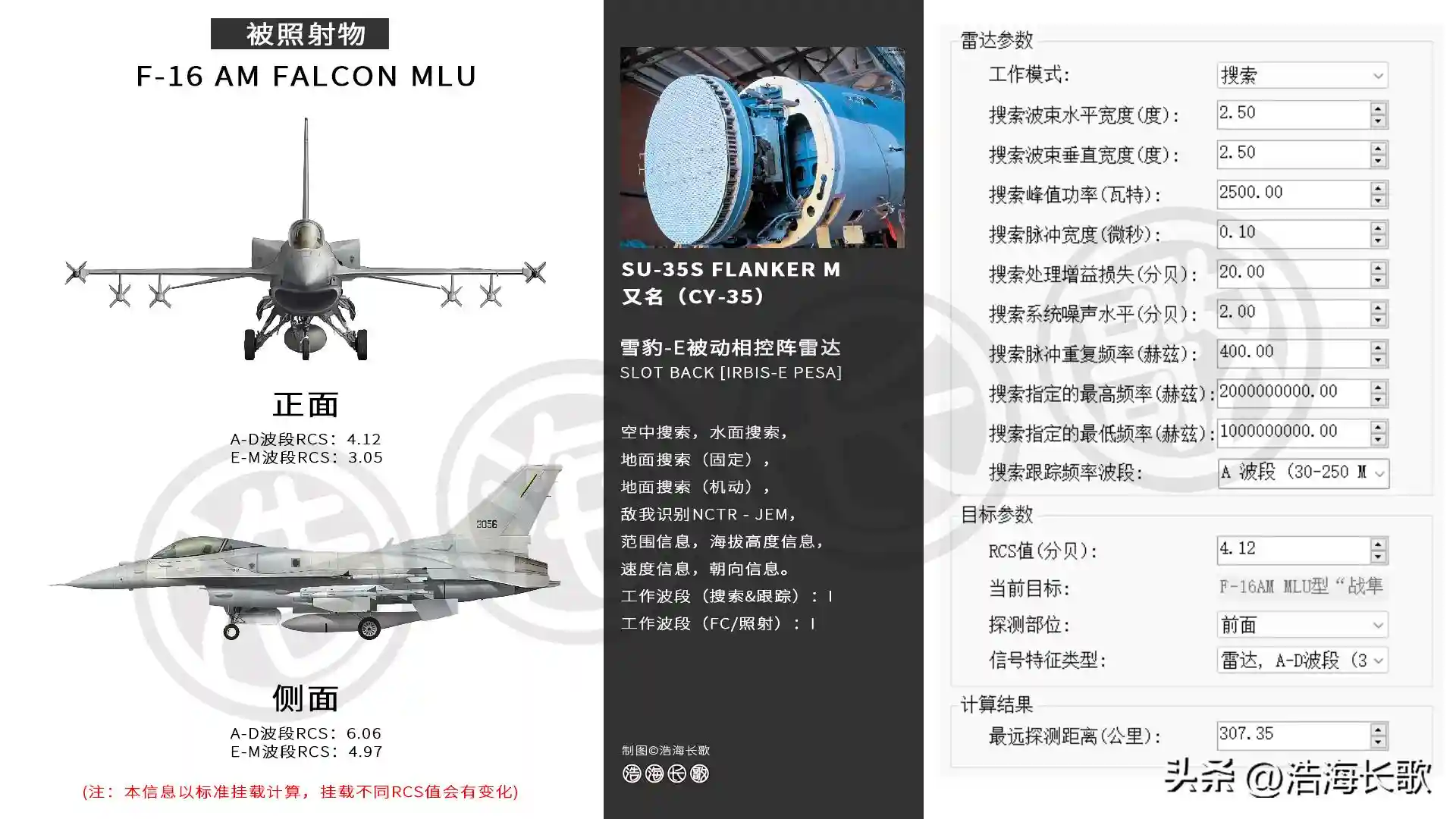 则苏35的“雪豹E”雷达在A-D波段下对F16AM的侧面探测最远距离为160.84公里,E-M波段下对F16AM的侧面探测距离为151.06公里。