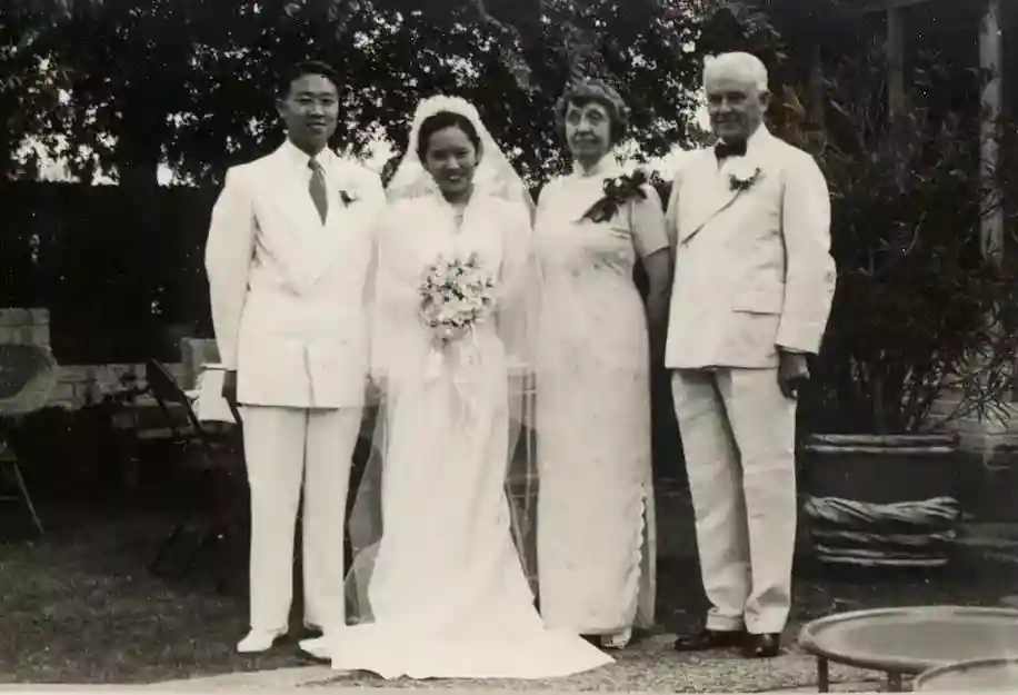 吴健雄与袁家骝(英文名LukeYuan)1942年5月30日婚礼留影于加州帕萨迪纳密立肯夫妇家中。右二、右一分别为格丽塔·密立肯、罗伯特·密立肯