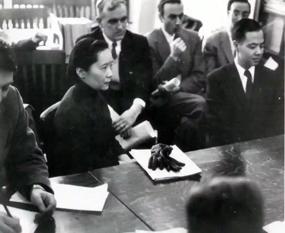 1957年1月15日,吴健雄与她的同事们,包括后来的诺贝尔奖获得者李政道(右),在哥伦比亚大学举行新闻发布会,宣布他们的开创性发现
