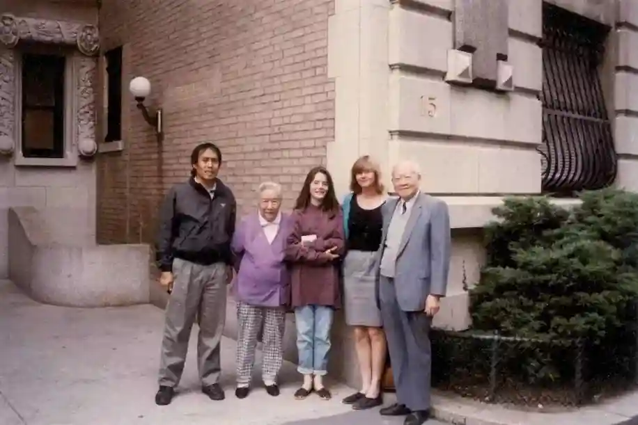 作者JadaYuan(中)与父亲Vincent、祖母吴健雄、母亲Lucy、祖父袁家骝(左起)1992年在克莱蒙特大道祖父母寓所外合影
