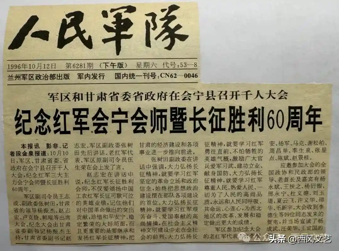 会宁,这个位于黄土高原丘陵沟壑区的陇中小城,因此被誉为“中国最佳红色旅游示范城市”而享誉世界。由于工作原因,我曾多次踏足这片红色土地,而最难忘的一次,莫过于1996年10月10日。那天,兰州军区和甘肃省共同举办红军长征胜利60周年纪念活动。我作为军区报社派出的记者,有幸参与见证了这一盛事。