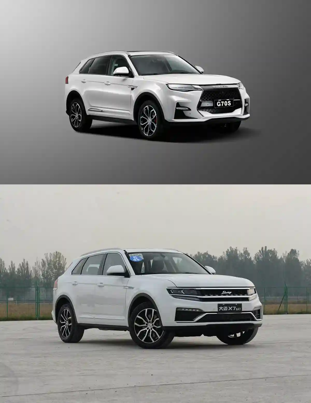如首发上市的大乘G70s,不仅有着与众泰大迈X7近似的外观、完全一致的车身尺寸,其来自航天三菱的2.0T发动机、8AT变速器参数,甚至车型的配置水平,都与后者如出一辙。