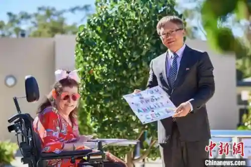 资料图:当地时间5月,孙晓轩接受残疾人服务中心居民代表AnitaJambanis回赠画作。DanielCarson摄