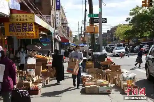 资料图:当地时间5月12日,纽约市布鲁克林八大道,商贩在摆摊做生意。中新社记者马德林摄