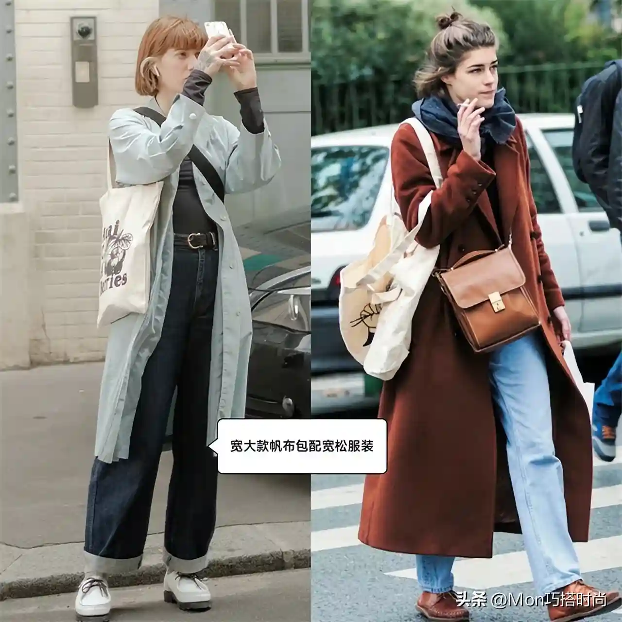 长款帆布包搭配灰色长风衣,是毫不刻意地高级;宽大的米色帆布包搭配及踝棕色大衣,配上尖头鞋、直筒裤的修身,也一点不臃肿。