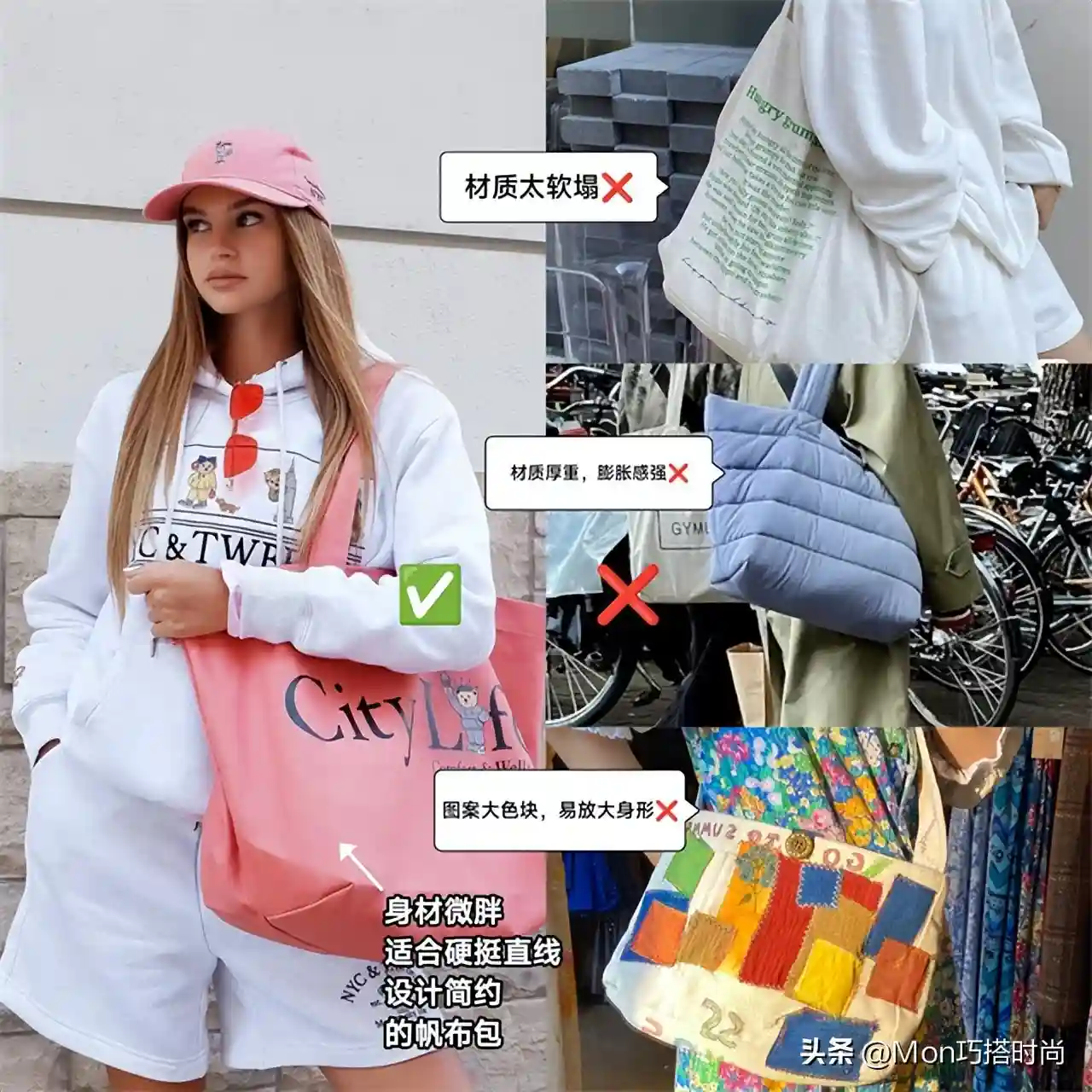 身材微胖或穿衣厚重的姐妹更适合选择直线款式、硬挺面料、设计简约的帆布包。过于软塌的质地、膨胀感强的羽绒、繁琐的大色块都容易显胖。