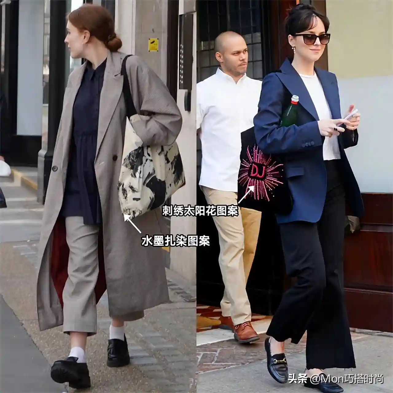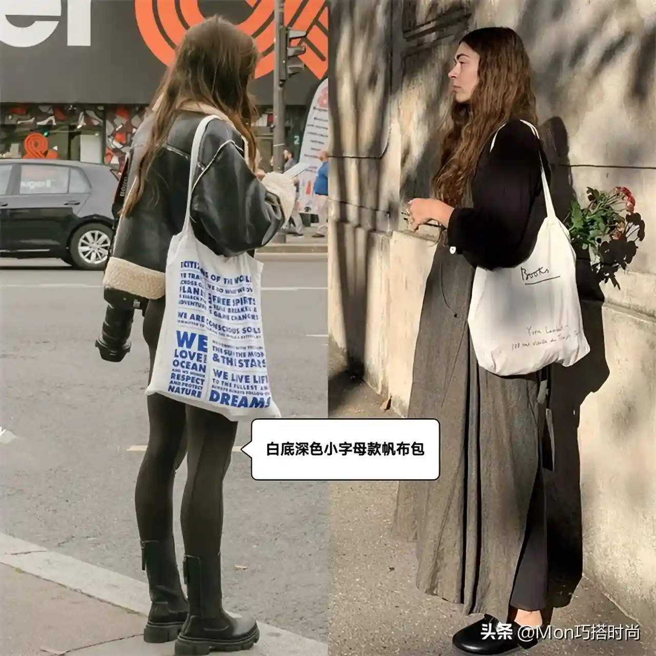 带小面积图案的帆布包是最百搭的。配上休闲的条纹卫衣松弛高级,搭配秋冬的毛呢西装也毫无违和感。