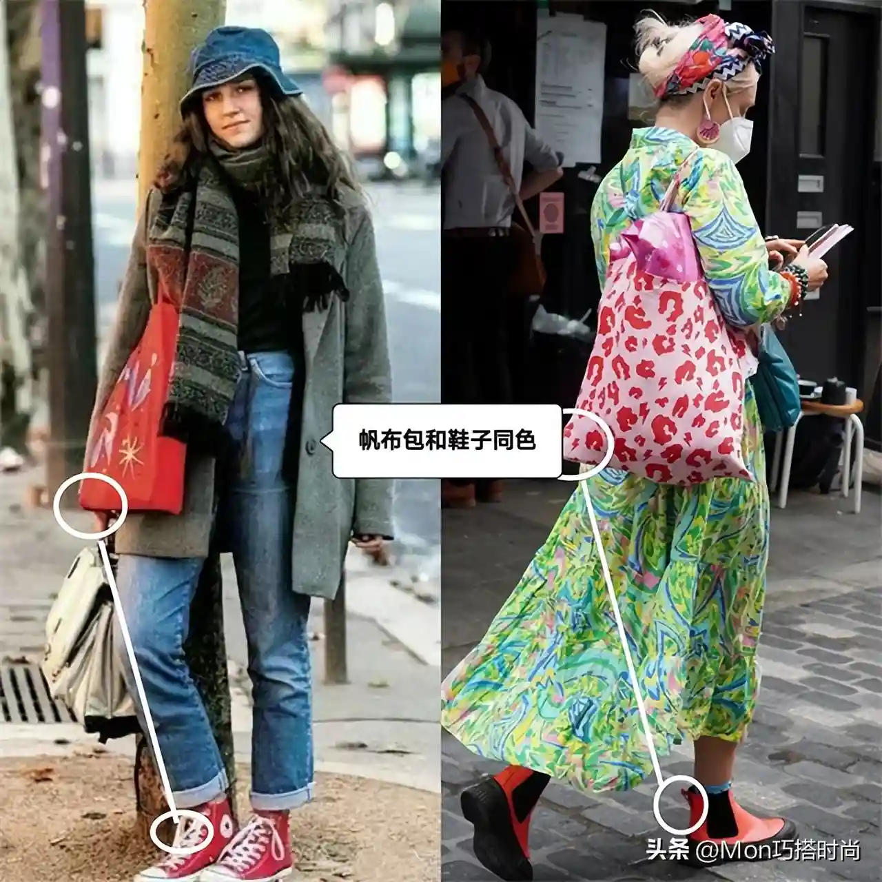 更有“心机”的穿法是让帆布包和鞋子形成颜色呼应,这种穿法用在彩色或图案款帆布包中最有时尚感,可是法国时髦精的最爱!