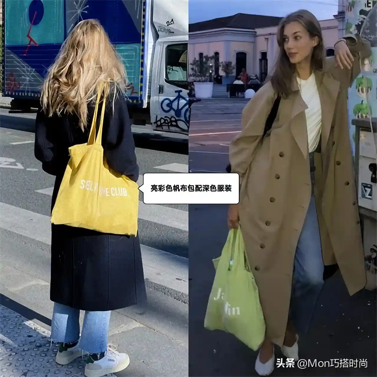 不过,彩色帆布包得搭配基础色服装。配风衣、大衣、毛衣,都是法式独特的时尚~