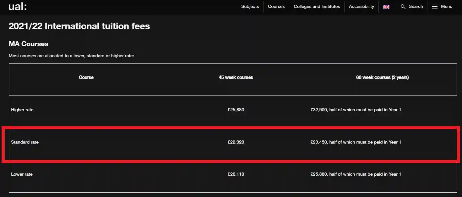 伦艺学费分为三档—Higher、Standard、Lower,我们取个中间值,用标准费率×45周课程来算,一趟留学下来要花费£22,920,折算成人民币大概19.5万元(按目前实时汇率计算)。
