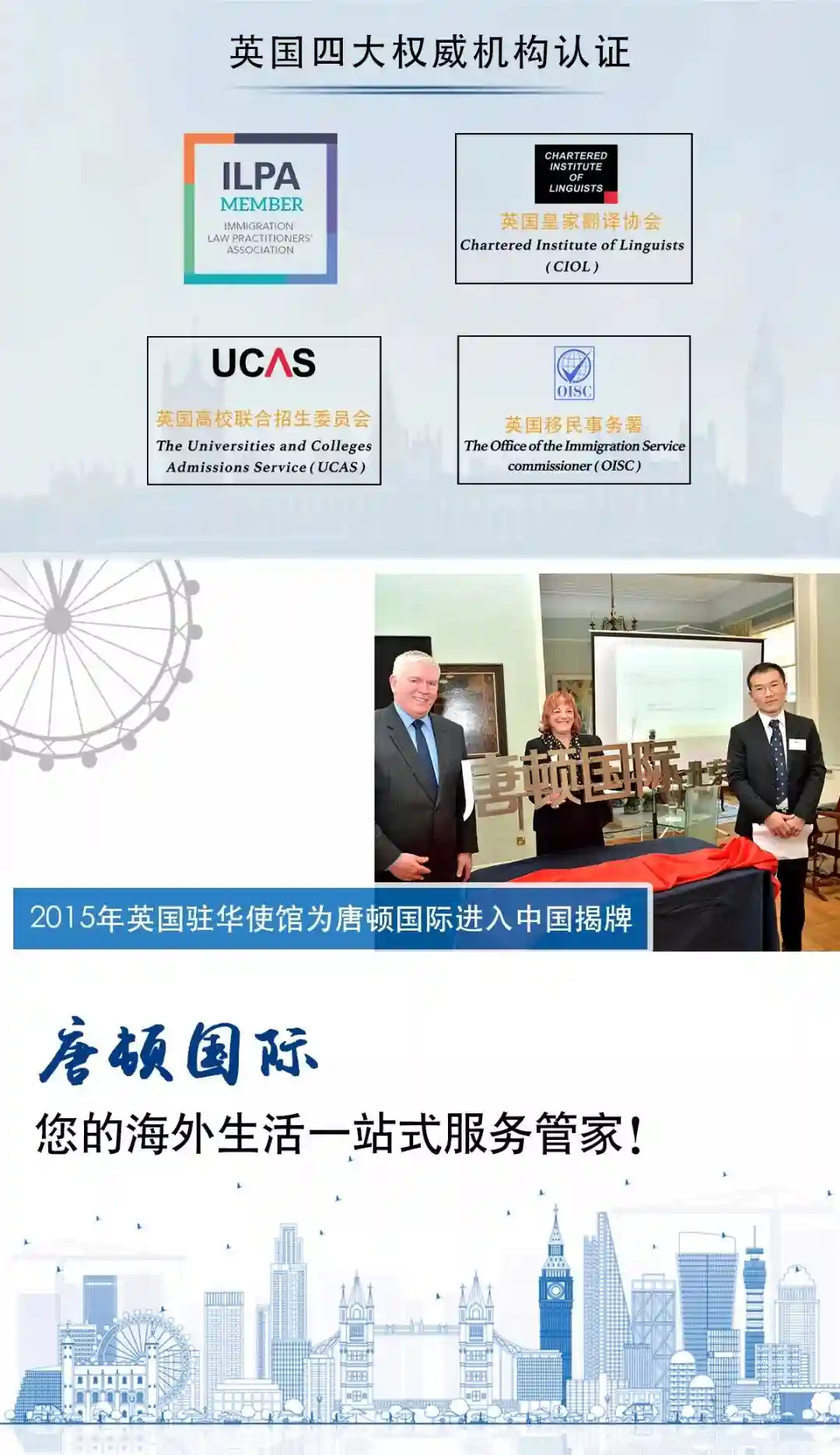 作为英国移民事务署OISC特许法律机构和英国移民律师公会ILPA的高级会员,唐顿针对每一位客户的需求,提供多维度的支持,包括海外创业投资,子女留学教育,或是在海外寻求高端医疗服务。