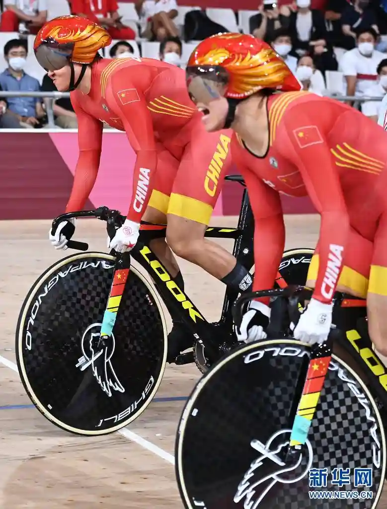 8月2日,中国选手钟天使(左)和鲍珊菊在东京奥运会场地自行车女子团体竞速赛中出发。新华社记者贺长山摄