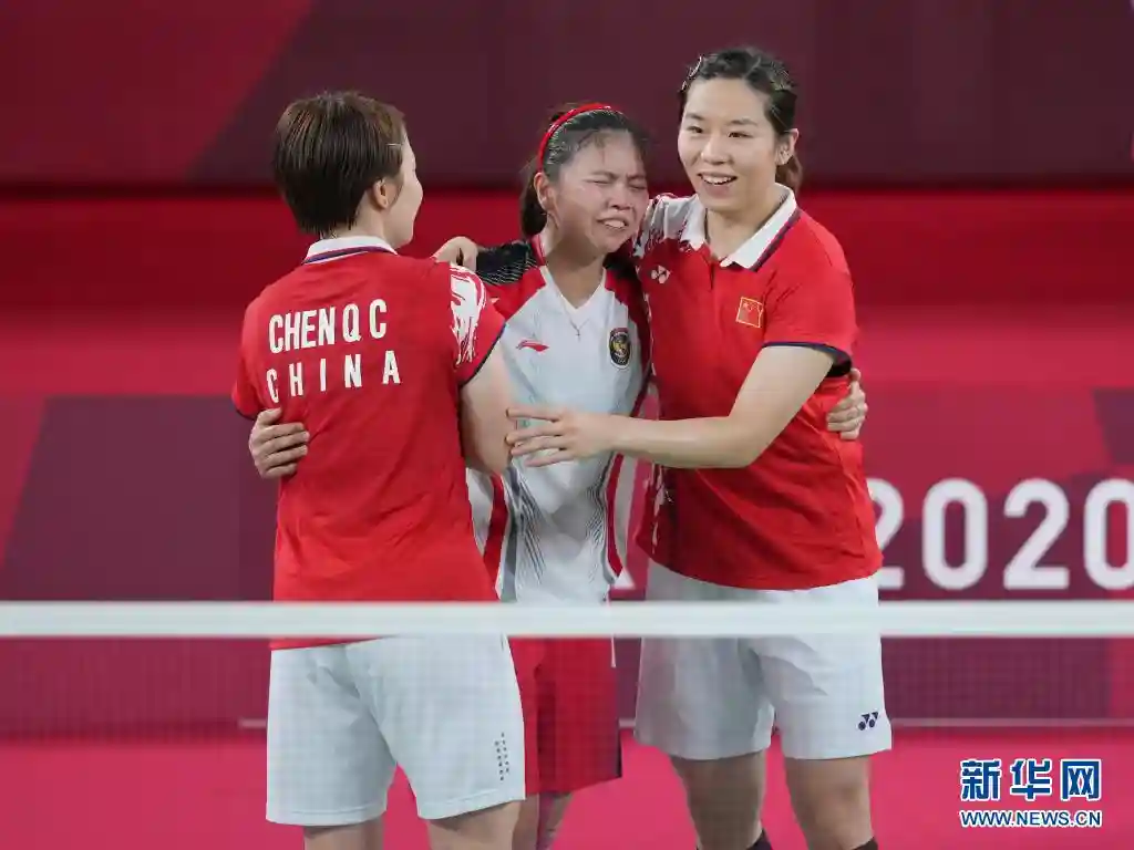 8月2日,中国选手陈清晨(左)与贾一凡(右)在羽毛球女子双打决赛后拥抱印尼选手波利。新华社记者薛玉斌摄