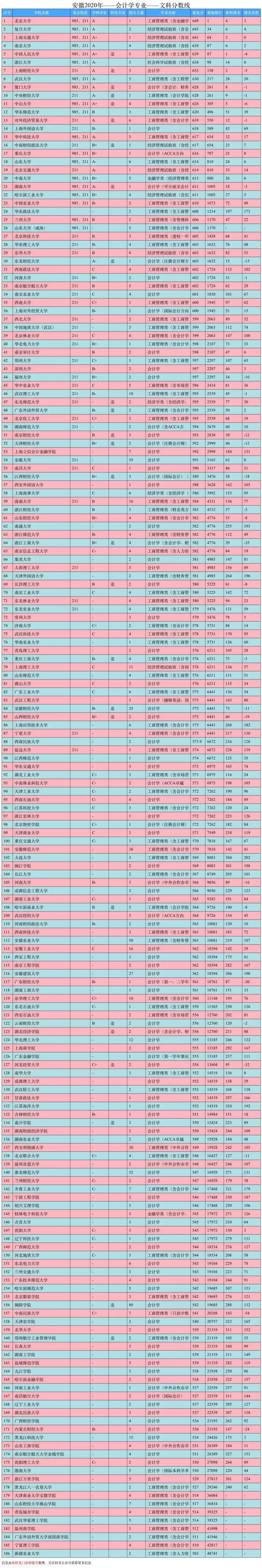 会计学专业同时招收文科和理科学生,下面来看看安徽省和河南省2020年文理科的录取分数线情况。有不少学科评估在B-以上,分数不高,比如重庆理工大学,属于特色专业,分数相对比较低。还有一些财经大学,分数也比较低,但是专业很强。