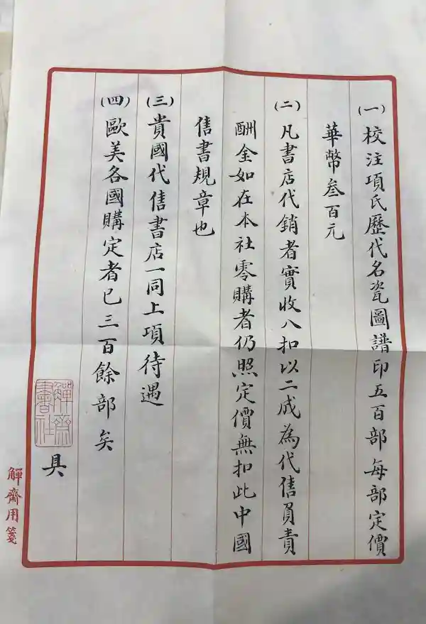 而该书定价三百元,尚且赔本,确实匪夷所思。关于该书的印数,之前一直没见到有说服力的史料。直到去年年底在保利公司的秋拍上,出现一通郭葆昌的觯斋书社致日本书店的代售书信,其中明确说道:“校注项氏历代名瓷图谱印五百部,每部定价华币三百元;凡书店代销者实收八扣以二成为代售负责酬金。如在本社零购者,仍照定价无扣。此中国售书规章也;贵国代售书店一同上项待遇;欧美各国购定者已三百余部矣。”
