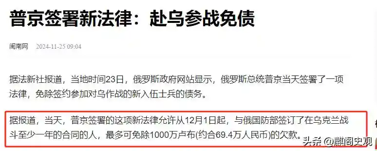 “普京签署的这项新法律允许从12月1日起,与俄国防部签订了在乌克兰战斗至少一年的合同的人,最多可免除1000万卢布(约合69.4万人民币)的欠款。”
