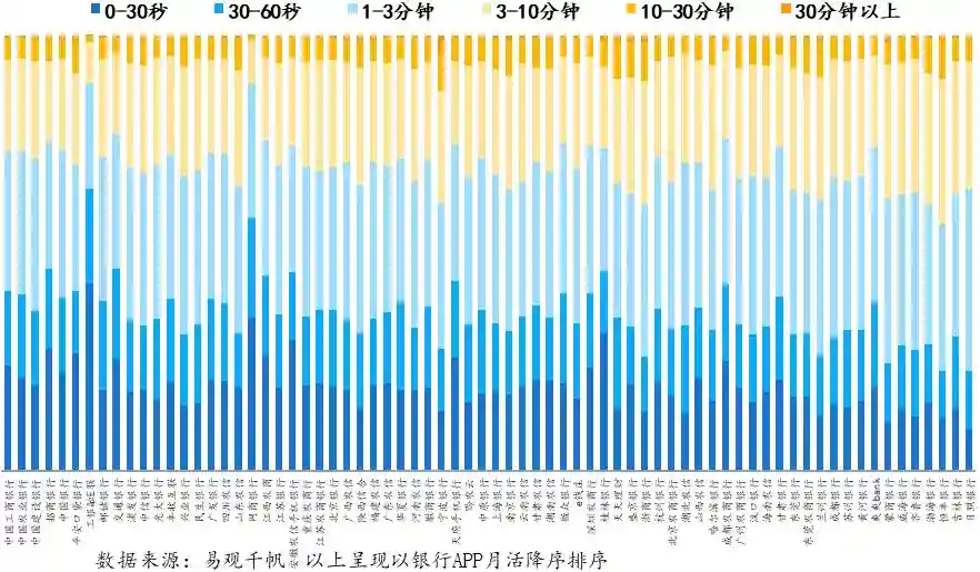 从手机银行APP用户的月度使用时长来看,主要集中在1至3分钟,约占三分之一,其次是在3至10分钟段。随着各银行机构逐步建立起以用户为中心的服务体系、从提升用户体验角度不断优化和升级手机银行APP,操作更为便捷、流畅,用户在操作使用的时长上被不断缩短。与此同时,各机构不断丰富自身的产品及服务内容,旨在延长用户的停留时长及服务生命周期,进而带动使用粘性和用户价值的提升。