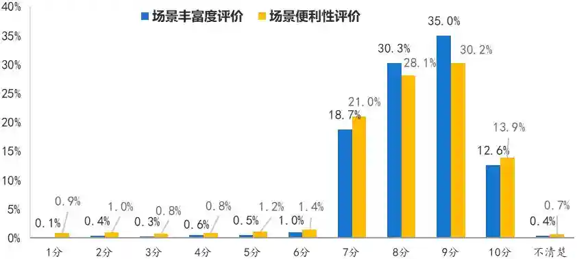 银行等机构结合各自的资源优势和业务发展目标积极布局场景生态,并不断延伸场景覆盖。用户在高频消费场景的渗透率普遍较高,近8成用户对场景的丰富度和便利性评价均达8分及以上。可见,通过高频消费场景带动低频金融消费效果显著,场景生态成为银行等机构数字化获客和活客的重要抓手。