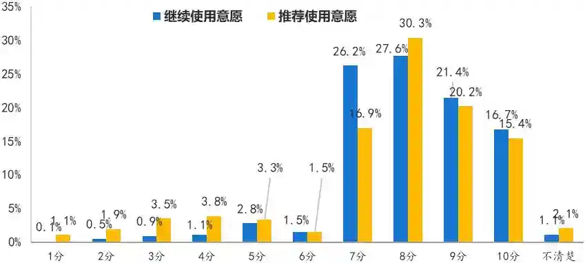 调研发现,用户对产品的继续使用意愿度在7分及以上的占比高达91.9%,而推荐他人使用产品的意愿度在7分及以上的占比达82.8%,可见,用户使用粘性和忠诚度很高。