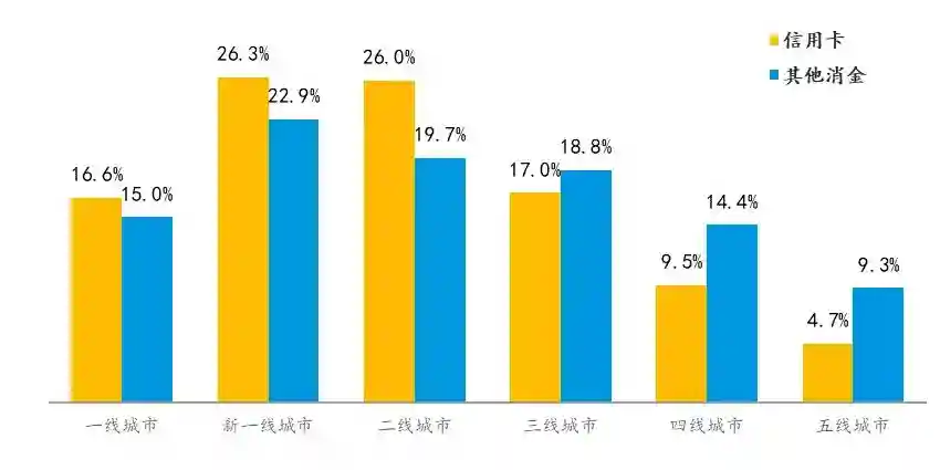 结合区域分布来看,信用卡新一线、二线城市的数字用户占比达52.3%,其他消费金融产品数字用户群的特征与信用卡数字用户类似,集中在新一线、二线城市,占比为42.6%,但其他消费金融用户在三、四、五线城市的分布显著高于信用卡的数字用户,这表明其他消费金融数字用户进一步向下沉市场渗透。