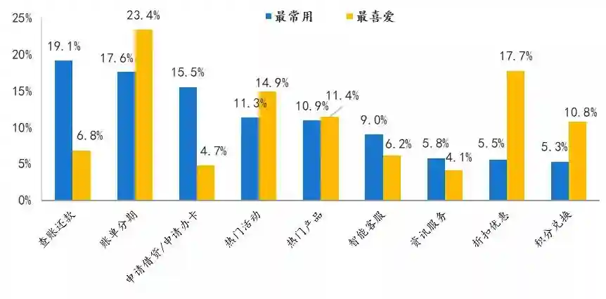微信银行中,用户最常用的功能分别是查账还款、账单分期、申请借贷/申请办卡,占比分别为19.1%、17.6%、15.5%。而最受用户喜欢的功能则是账单分期,占比为23.4%,其次是折扣优惠,占比为17.7%;再次是热门活动,占比为14.9%。从调研结果来看,受用户欢迎的功能主要为通过微信银行获取热门活动推荐信息、享受优惠权益等。