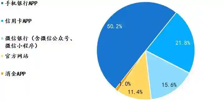 在信用卡等消费金融服务的用户最常使用的线上服务平台中,选择APP应用服务的占比超过了70%,其中,最受欢迎的是手机银行APP,占比50.2%;其次是信用卡APP,占比21.8%,该比例较低的部分原因是一些银行暂无独立信用卡APP,主要通过手机银行APP提供服务。