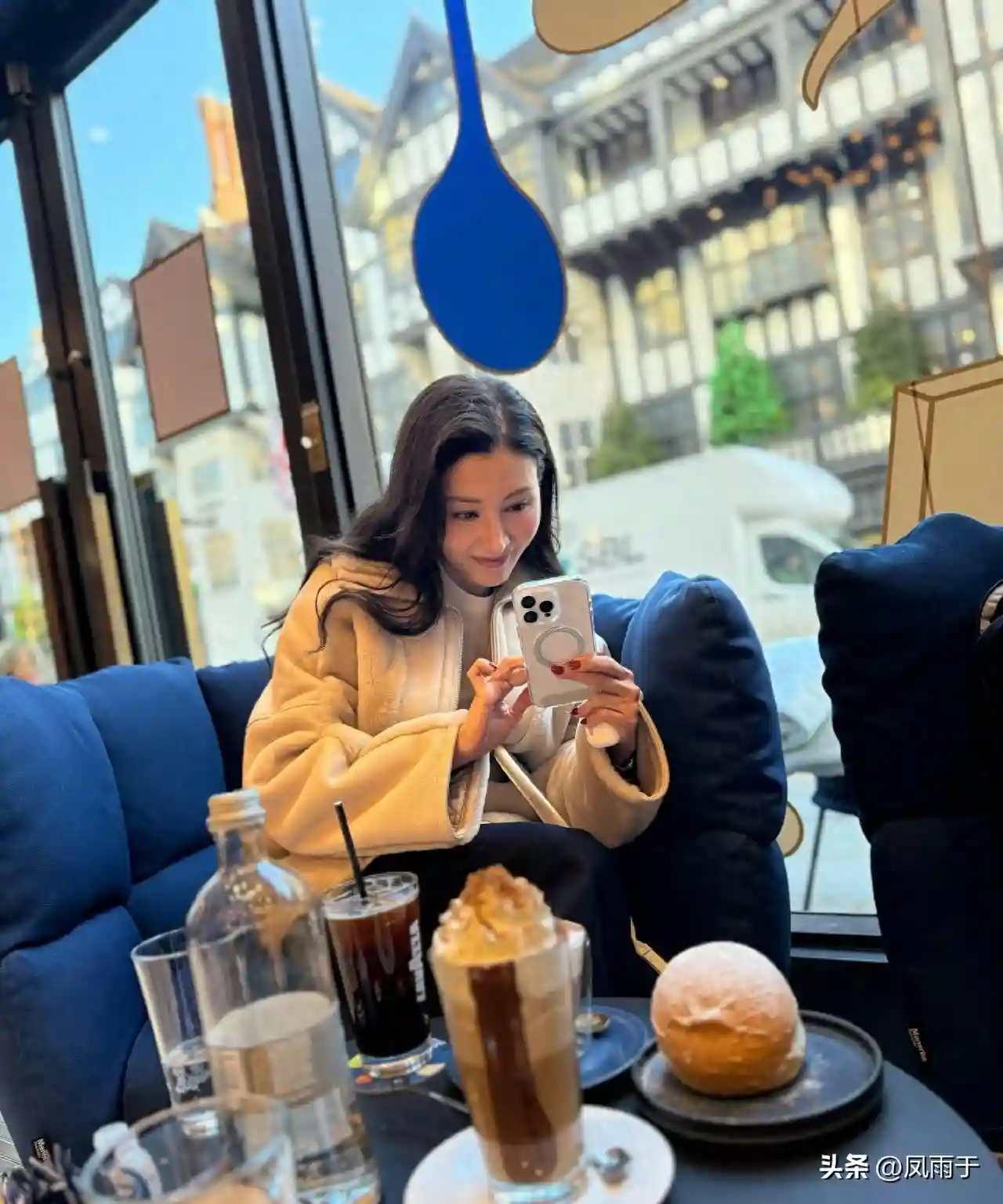 这张照片,是她难得在社交平台上更新的近况。照片里的她,一袭白色上衣搭配米色绒面外套,妆容精致,气质高贵,宛如一幅美丽的油画。桌上的三杯饮品,似乎暗示着一家三口正享受着这难得的悠闲时光。