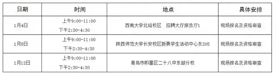 根据网上报送信息情况,招聘部门在即墨区或赴有关高校集中进行现场报名并进行资格审查。资格审查过程中对考生组织现场答辩,了解考生的语言表达、应变能力、分析能力、专业水平等综合素质,对通过资格审查人员发放面试通知书。