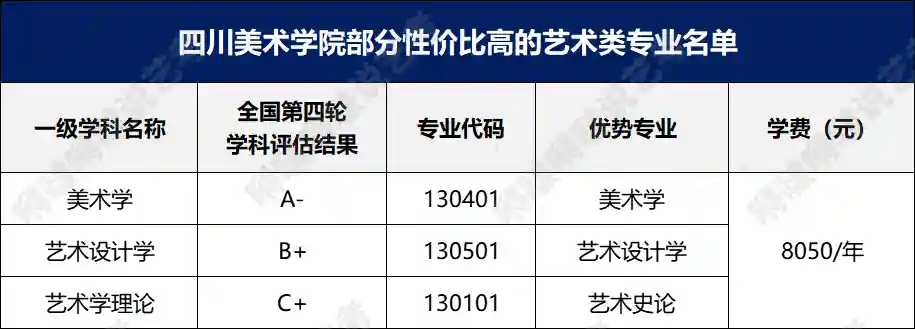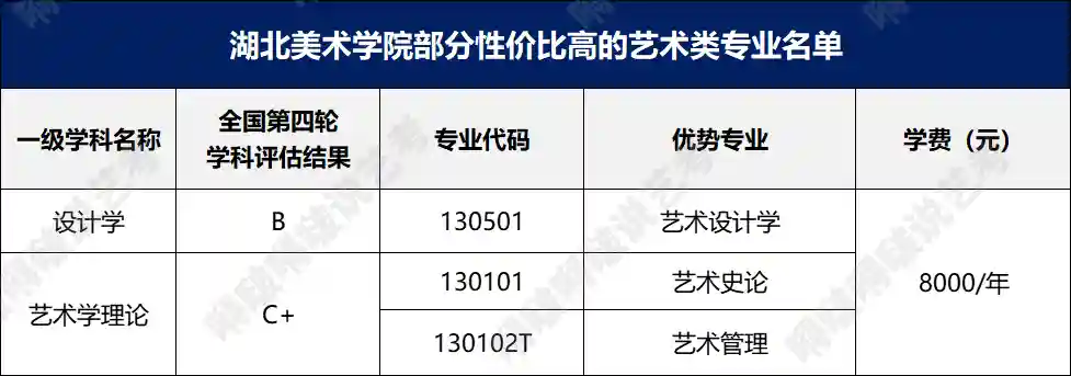 01.艺术类院校一般来说,在独立设置的本科艺术院校中,艺术学理论类下设的专业,课程多以理论课为主,学费比其它艺术类专业低,例如:中国美术学院、湖北美术学院、四川美术学院的艺术史论专业等。