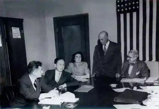 第二会谈是由我方提出会谈地点,还是选择在国联大厦,不过房间里有一张长桌子。双方对面而坐后,约翰逊直接递过来一张纸,上面写着美方要求中方释放人员的名字。