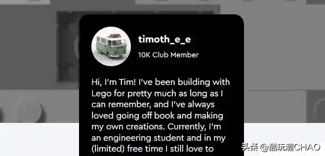 关于作者作者的IDEAS账号名为timoth_e_e,又名Tim。从他记事起,就一直玩乐高积木搭建各种东西,他一直很喜欢摆脱说明书的限制,搭建属于自己的作品。目前Tim是一名工程专业的学生,在他有限的空闲时间里,仍然喜欢用乐高积木进行搭建和创作。他最喜欢做的事情之一就是用乐高积木重现现实生活或电影/电视节目中的事物。