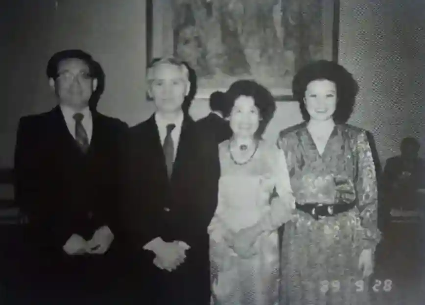 ▲1989年国庆招待会上与张文朴大使(左二)和大使夫人张沛(右二)合影