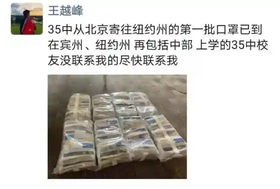 据介绍,此前,不少身居海外的北京三十五中国际部留学生,在海外集合留学生资源,主动为武汉众筹助力,其中就包括2018届毕业生王越峰。疫情暴发后,正在坐落于美国纽约的雪城大学就读的他,第一时间在学校发起“留学生给国内进行捐款倡议”,为国内筹集到5万多美金。而在此次“全球口罩援助计划”中,他当起了在纽约州的联络人,负责发放已收到的1600个口罩。